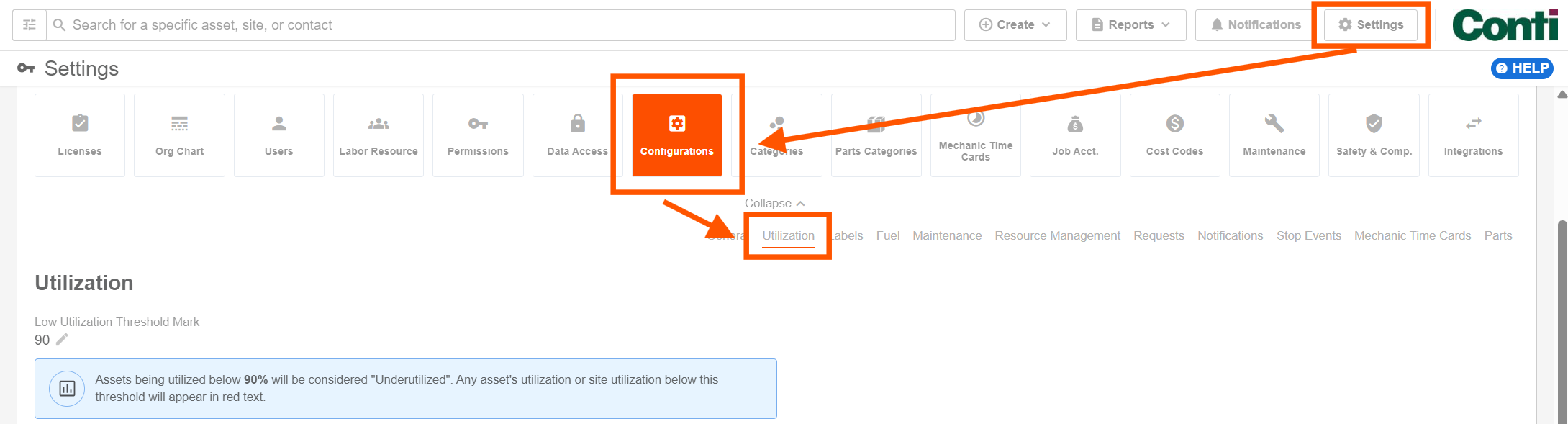 - Select "Settings" on the top right of your screen. Then, click the Configurations > Utilization tabs.
