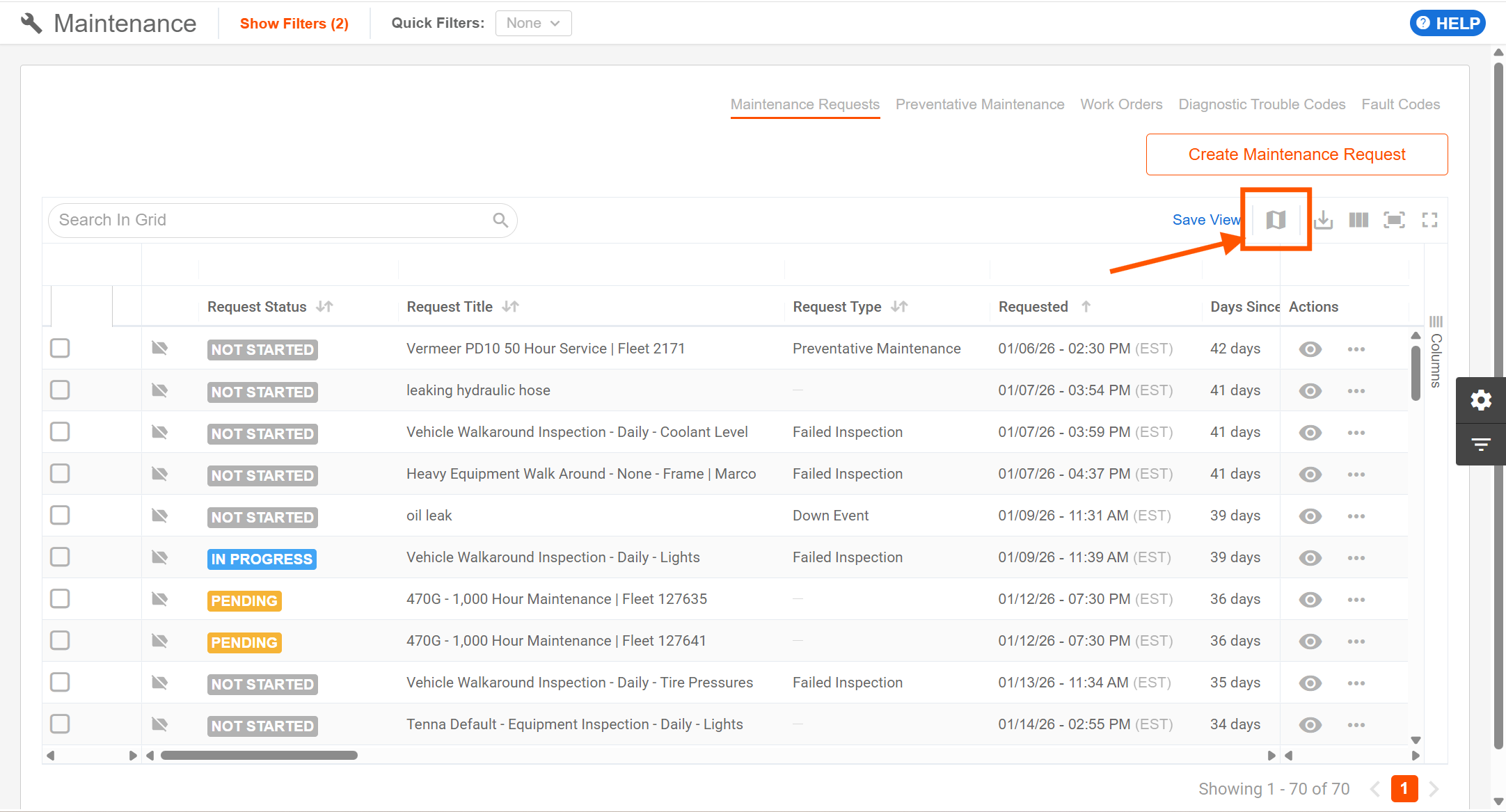 The View in Map button in Maintenance allows you to view all Maintenance Requests in the grid, but in a Map View. This helps you to visualize where open Maintenance Requests are around the globe.