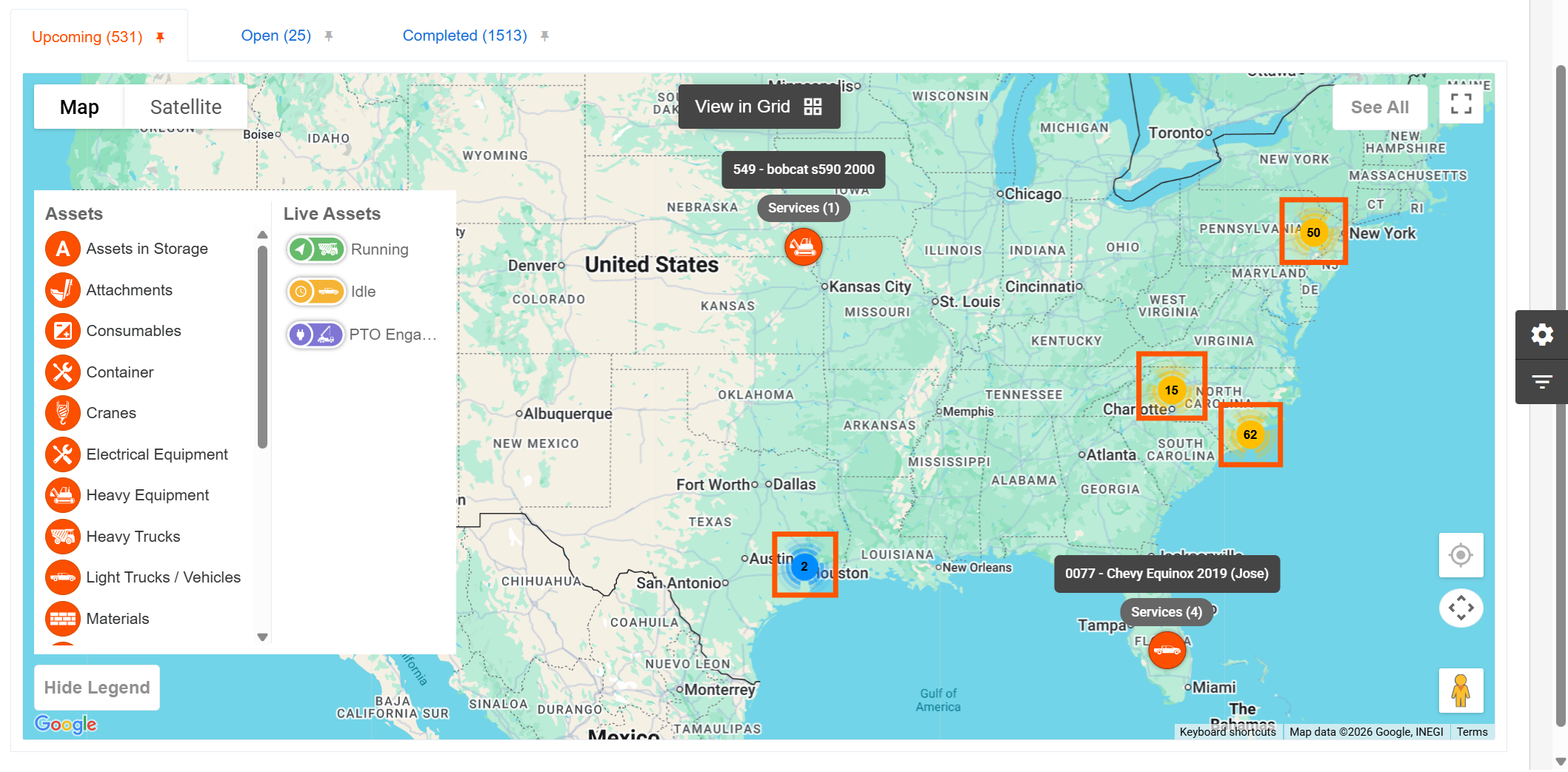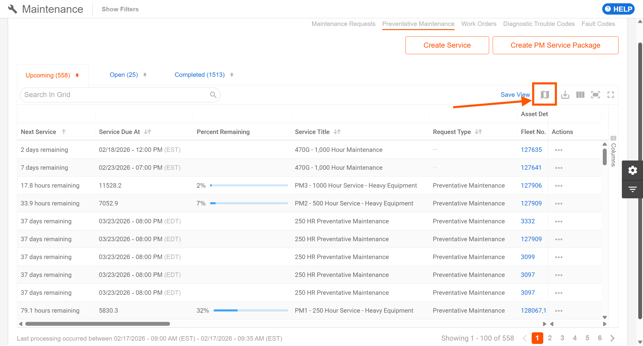 The View in Map button in Maintenance allows you to view all Preventative Maintenance Services in the grid, but in a Map View. This helps you to visualize where Services are around the globe.