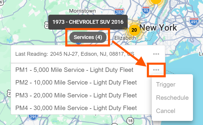 - In the Upcoming Preventative Maintenance grid, select the three dots icon under the Actions column next to the service you would like to trigger.