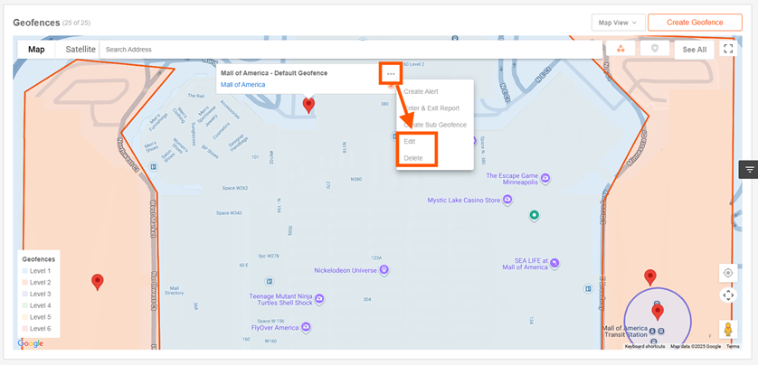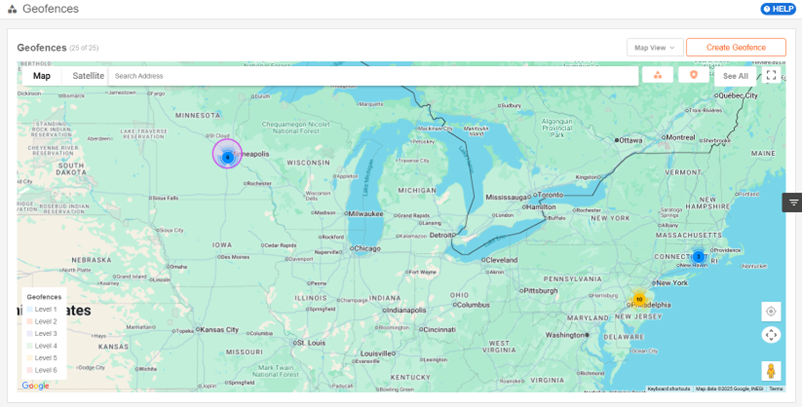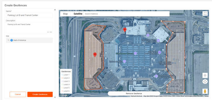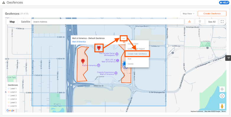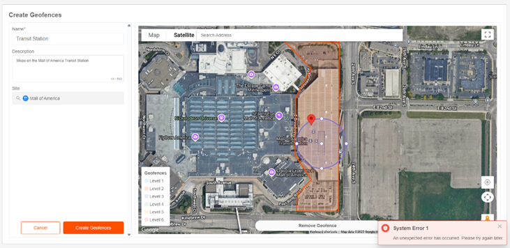 For example, a Geofence drawn within a Level 2 Geofence will automatically be a Level 3 Geofence. You may not “skip” a level by designating a new Geofence as a Level 3 when it is not within a Level 2 Geofence.