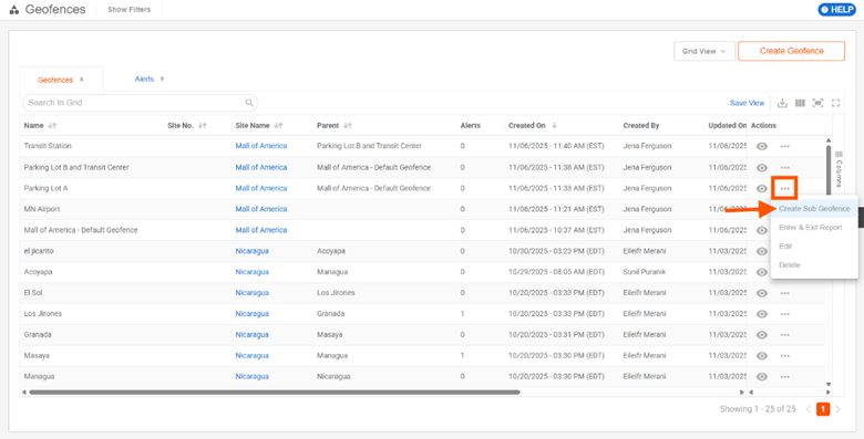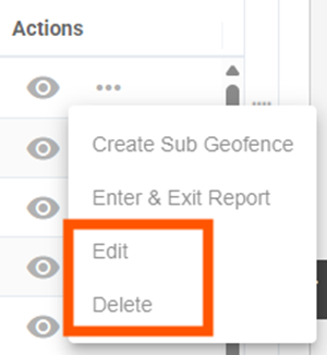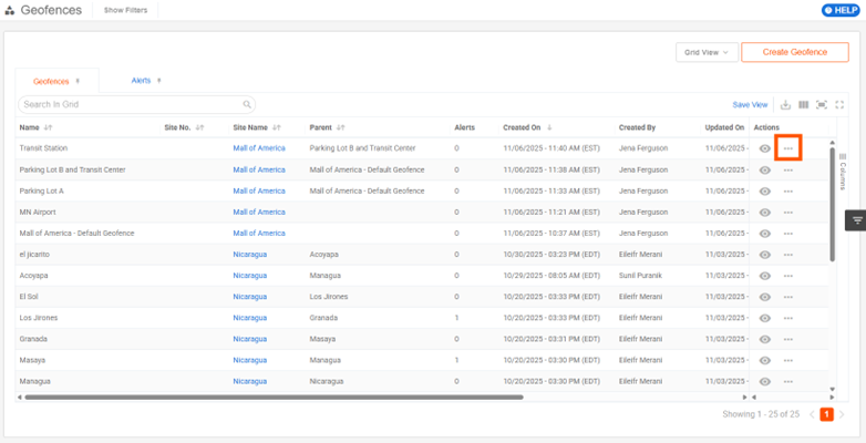 - From the Grid View, click the dotted icon next to an existing Geofence.