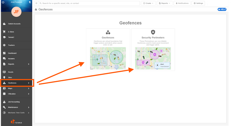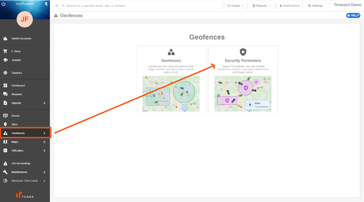 Geofences and Security Perimeters can be viewed in a few key areas in Tenna: