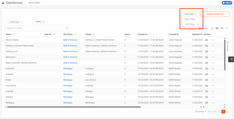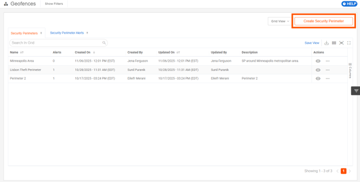 - Both Geofences and Security Perimeter pages have a Grid View or Map View.