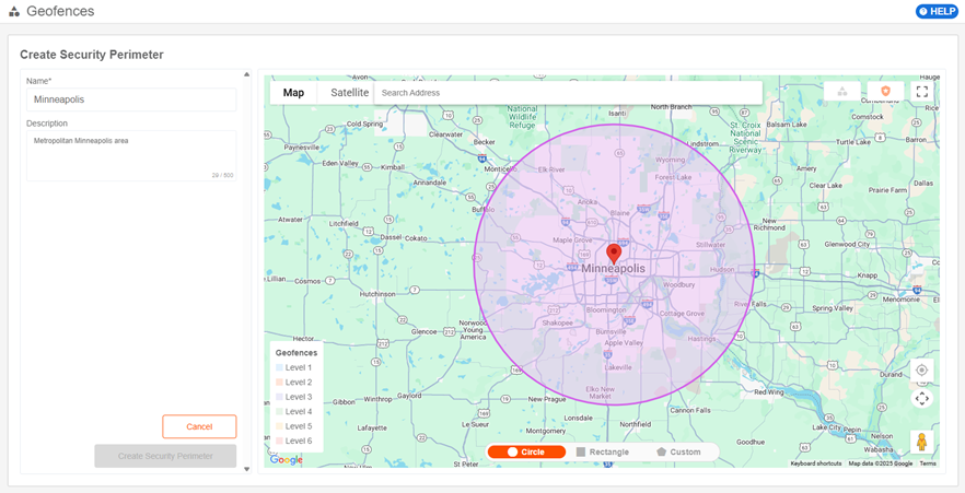 Geofences and Security Perimeters can be created when creating a Site or in the Geofences feature. It is required to create at least one Level 1 Geofence in order to create a Site.
