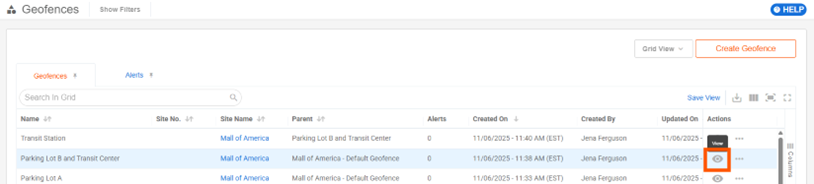 - In Grid View, click the eye icon next to the Geofence or Security Perimeter you would like to view.