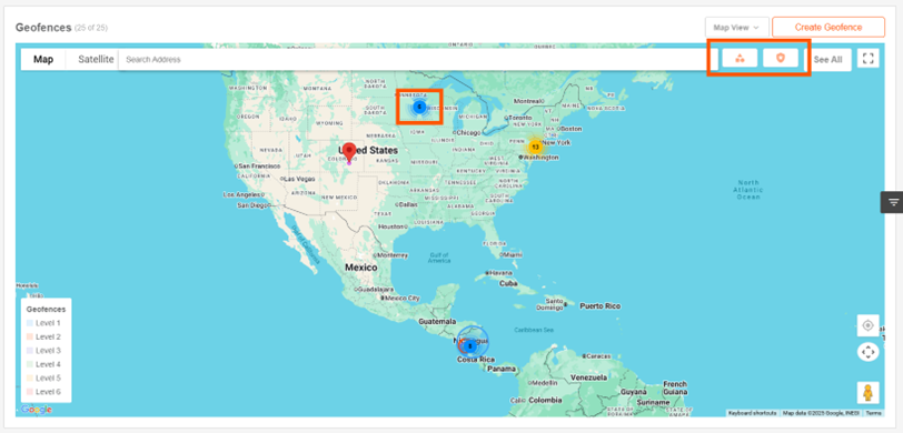 - Click the shape icon to show/hide Geofences; or the badge icon to show/hide Security Perimeters.