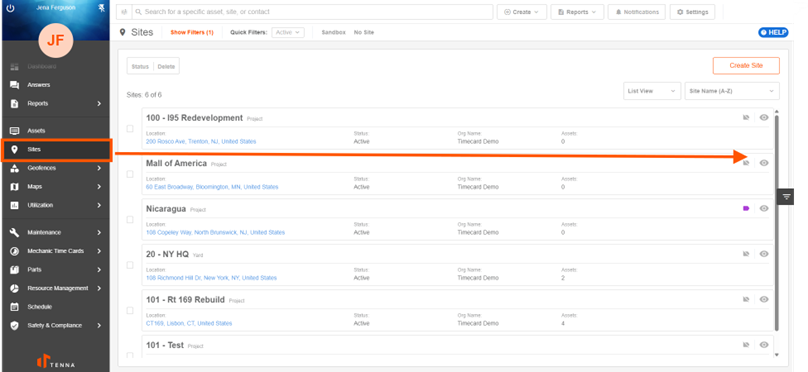 Click Sites on the left side navigation, then click the eye icon next to a Site.