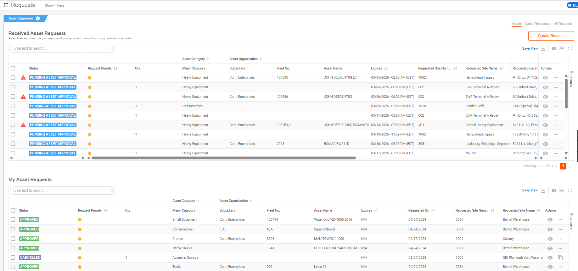 - View requests by type using the Assets, Labor Resources, or All Requests tabs