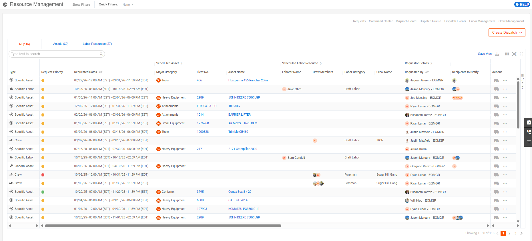 Once requests are submitted, the dispatch or resource management team uses dedicated tools to turn those requests into scheduled deployments. From here, dispatchers can: