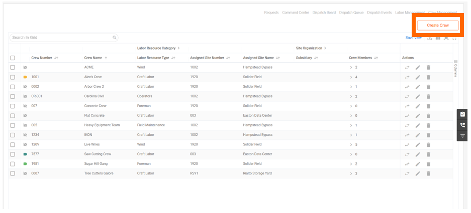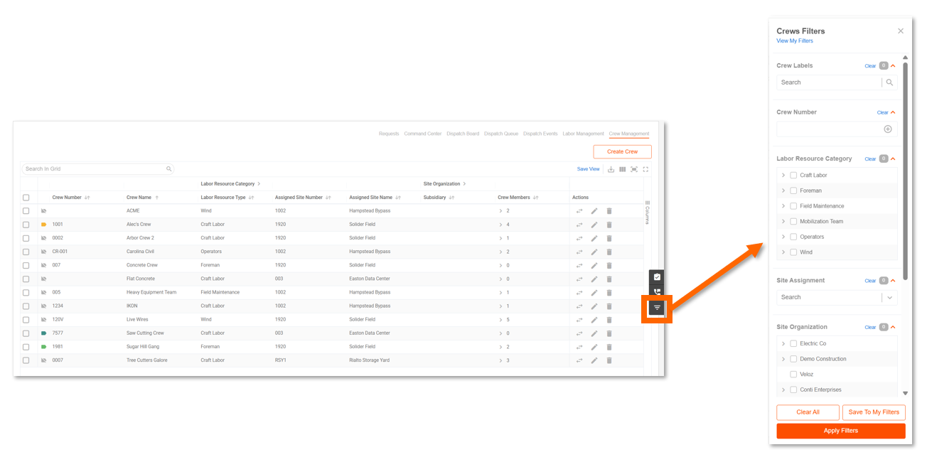 Open the filters panel on the right side of the page to narrow down your crew list. Available filters include crew labels, crew number, labor resource category, site assignment, and site organization.