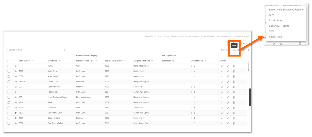Use the Export option to download your full crew list. Exports include all visible columns except the Actions column and are available in CSV, XLSX, and XML formats. Tenna exports all crews in your account — not just the current page.