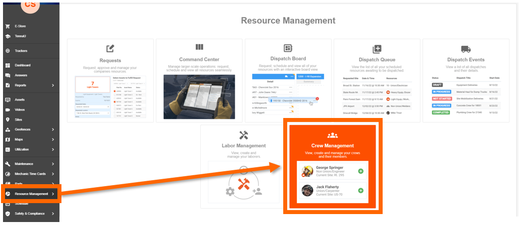 - Click "Resource Management" on the left navigation menu, then click the "Crew Management" tile.