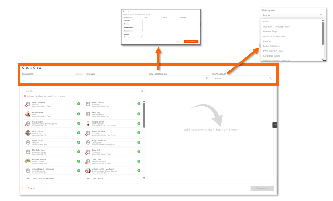 Crew and laborer site assignments are automatically kept in sync: