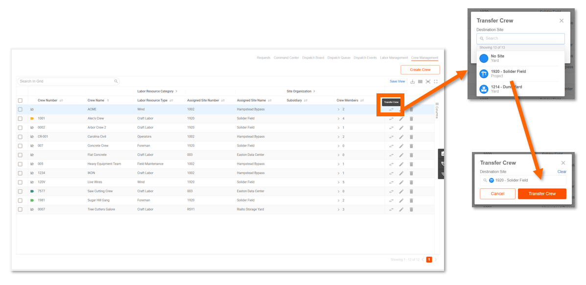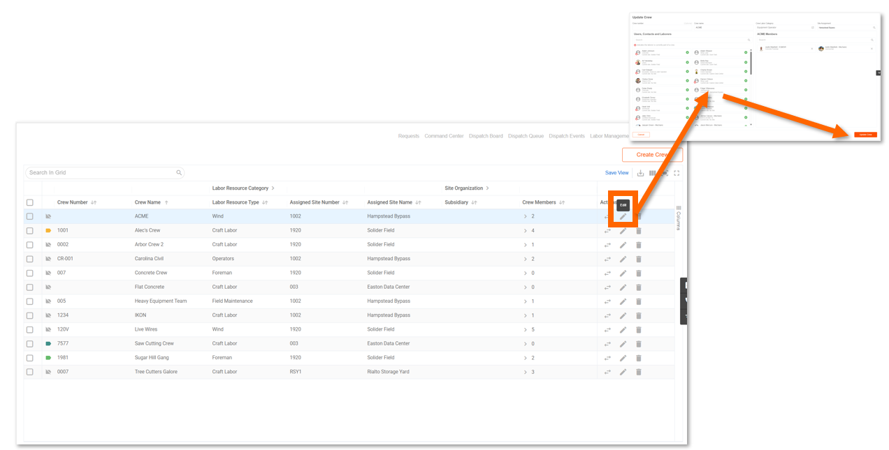 - Changing a crew's site - All current crew members are updated to the new site. A confirmation prompt will appear before the change is applied.