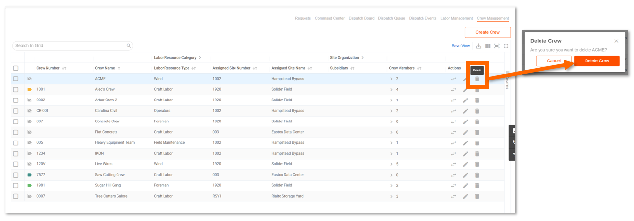 To remove a crew, find it in the table and click the trash (delete) icon in the Actions column. Confirm the deletion in the modal that appears. Deleting a crew removes the crew configuration but does not delete the individual laborers within it.
