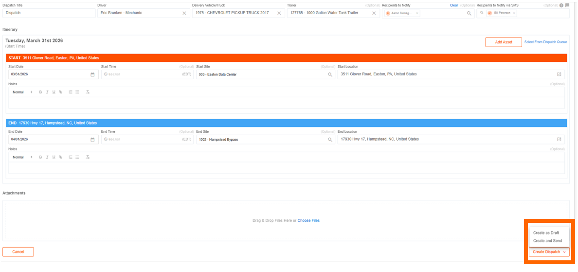 - Create Dispatch Events allows permissioned users to create dispatch deliveries for assets and labor resources