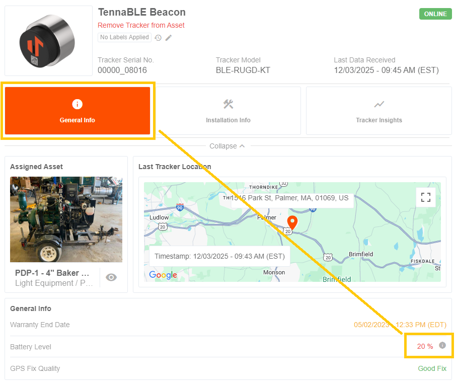 If the battery status is available, you can view it in Tracker Details > General Tab.