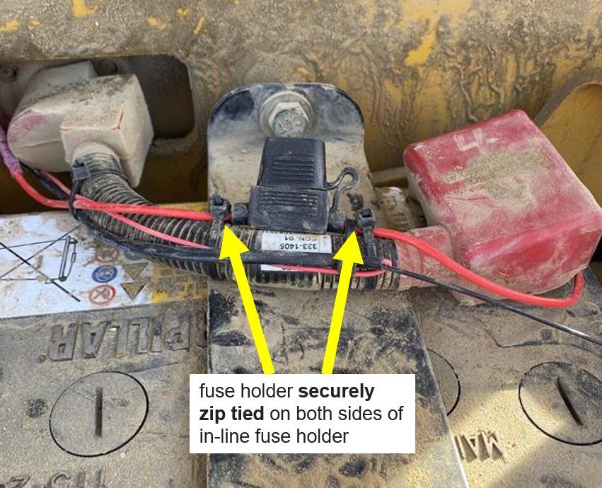 - Take a picture of the power wire connection with fuse holder securely zip tied on both sides of in-line fuse holder and inline fuse mounted as close to positive battery terminal as possible