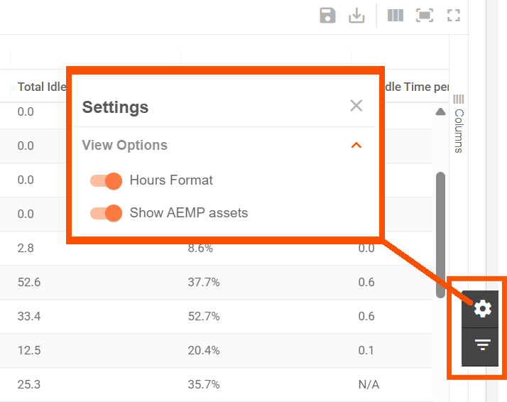 Pro Tip! Total Idle Time and Avg Idle Time per Trip can be shown in as a decimal rounded to the nearest tenth of an hour or as xx h xx m xx s. Click the gear icon on the right side of the grid and toggle the Hours Format on or off to your preference.