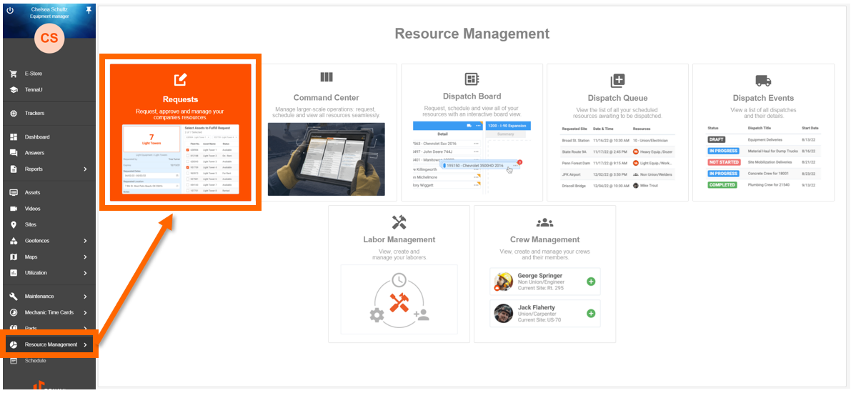 - Click Resource Management on the navigation menu on the left side of the screen, then click the "Requests" tile.