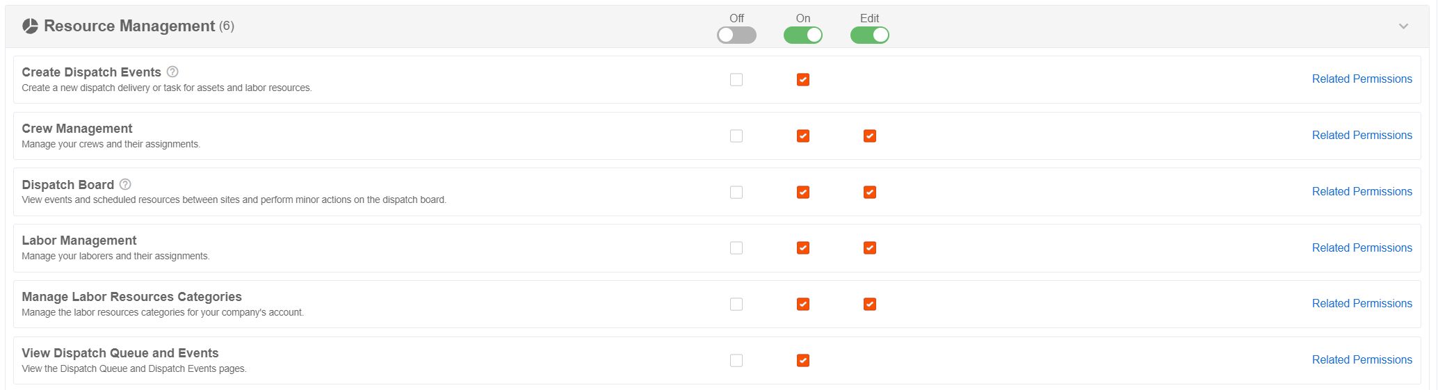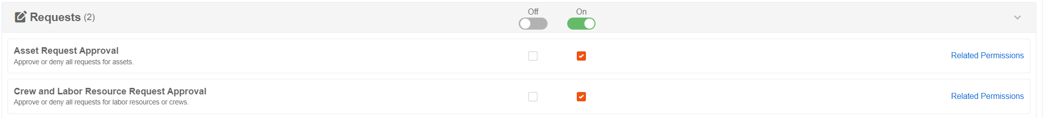 - Crew and Labor Resource Request Approval: Approve or deny all requests for assets. This permission should be turned ON for any user approving Crew and Laborer requests (i.e. Foreman/Site Super).