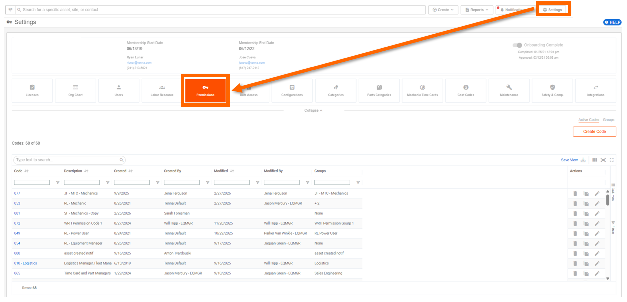 To access the permissions page click "Settings" at the top right of the global navigation page, then "Permissions". Here you can either create a new permission code or edit an existing one.