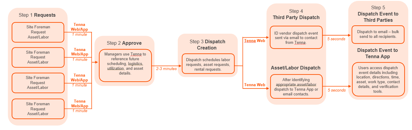- Notifications are sent through the Tenna platform when a dispatch event is created, cancelled, or completed.