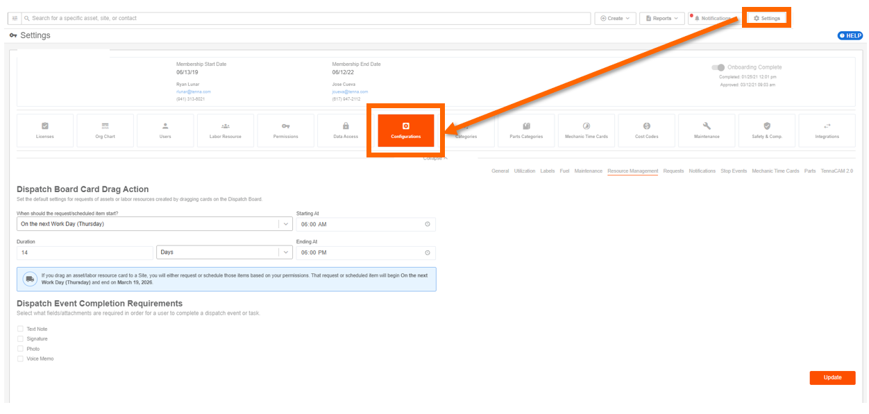 Resource Management notifications are managed through the Requests and Dispatch modules — not the configurations section.