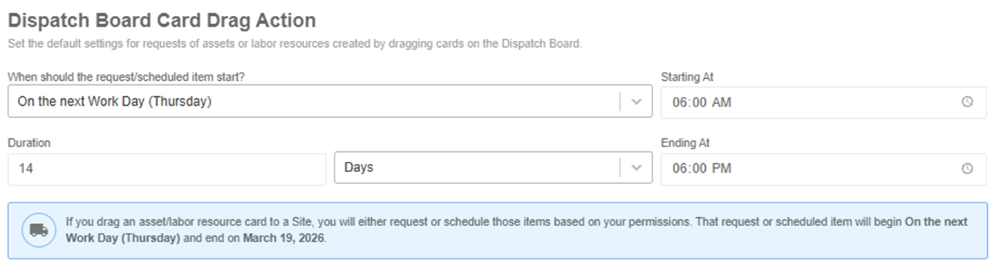 Set the default behavior for asset and labor resource requests created by dragging cards on the Dispatch Board. These settings control how new requests or scheduled items are pre-filled when you create them on the dispatch board.