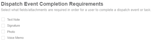 Select what attachments, if any, are required to mark a dispatch event or task complete.