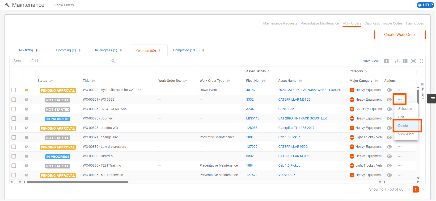 - Click the "..." icon on the right side of the line of the work order you want to edit. Then click "Delete".