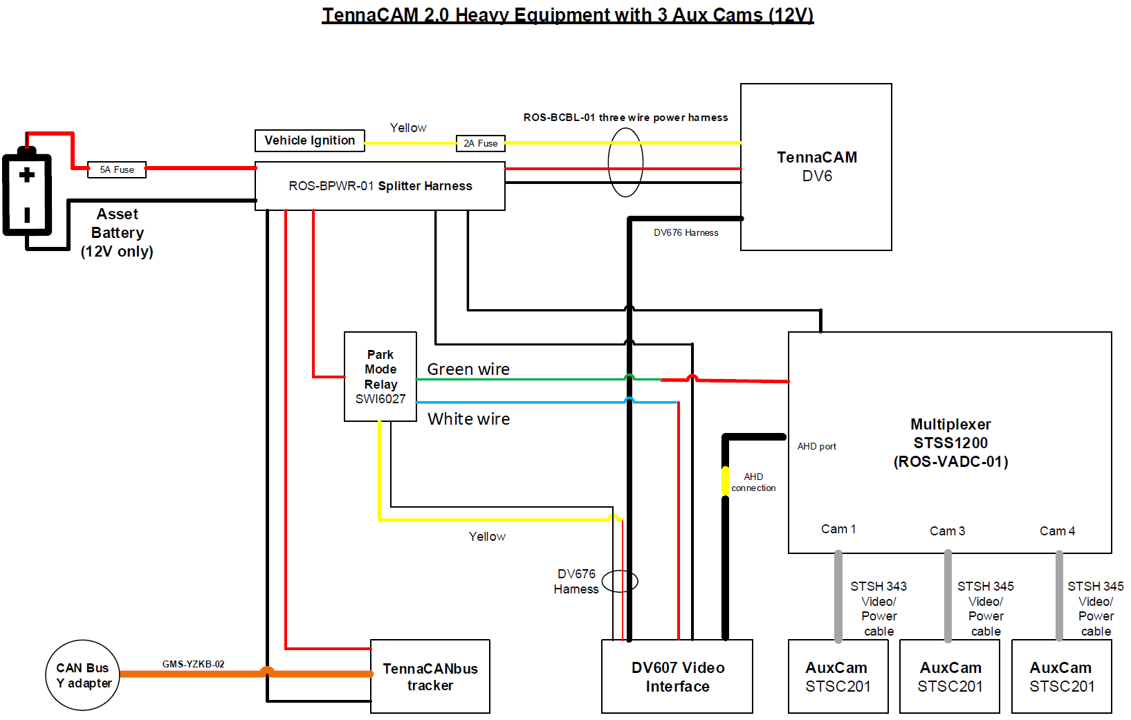 Below are instructions for installing rear and side auxiliary cameras (TCM-ABKS-02) to an existing TennaCAM 2.0 Heavy Equipment system (TCM-ROGM-05, TCM-ROGM-07).