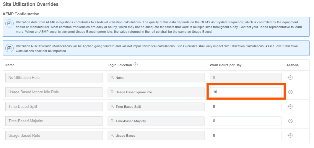 Instead of a site using the configured work hours per day as set for a particular Utilization Rule, users can “override” those for a particular site.