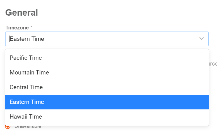 Options include Eastern, Pacific, Mountain, Central, and Hawaii timezones.