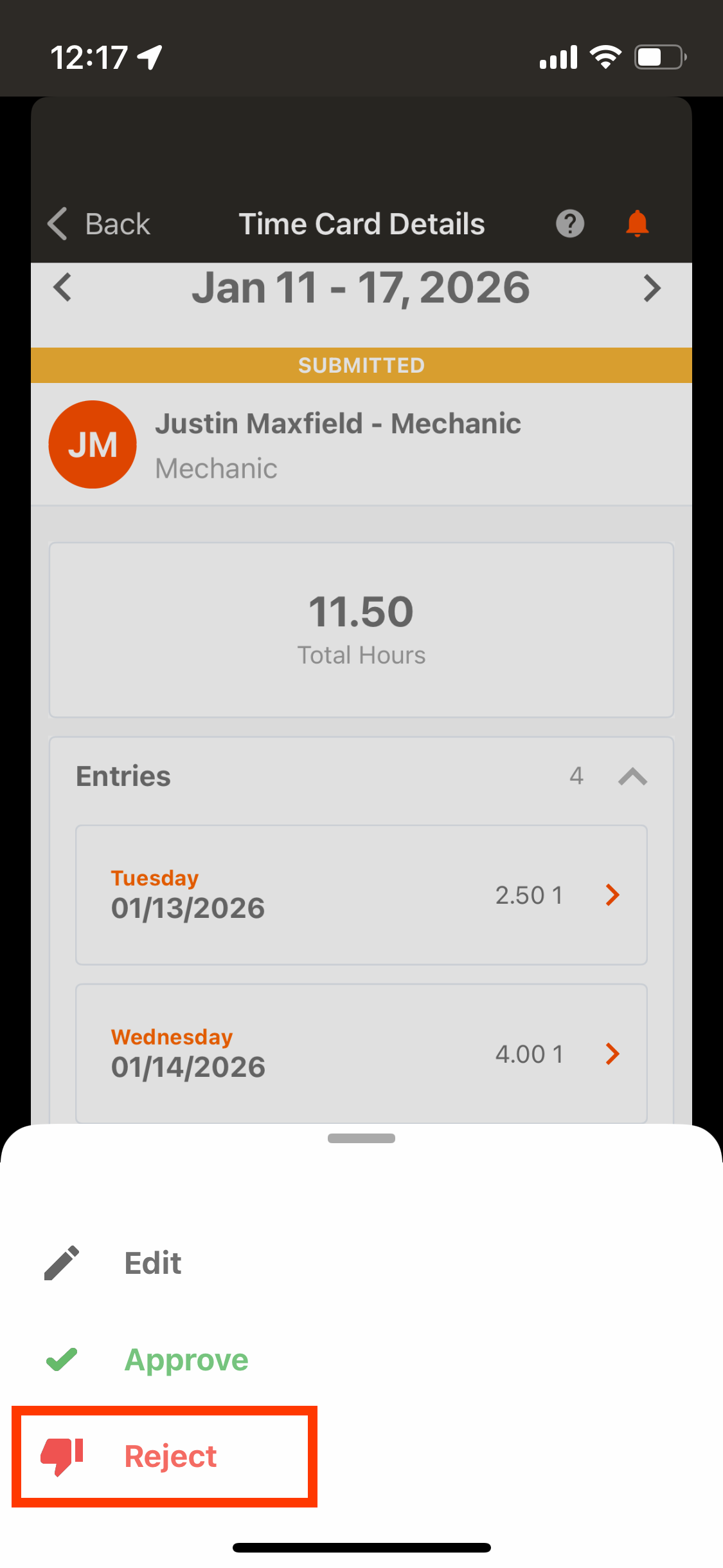 Tap "Reject" to deny the time card.