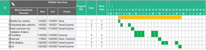 The timeline is an average of 10-20 days beyond kickoff. The following example assumes the activity starts the first of January 2023 and extends for 20 days (14 business days).