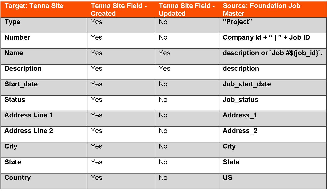 When a job is added or updated in Foundation, the integration will search Tenna "Site Name" to match Foundation "Job Description".