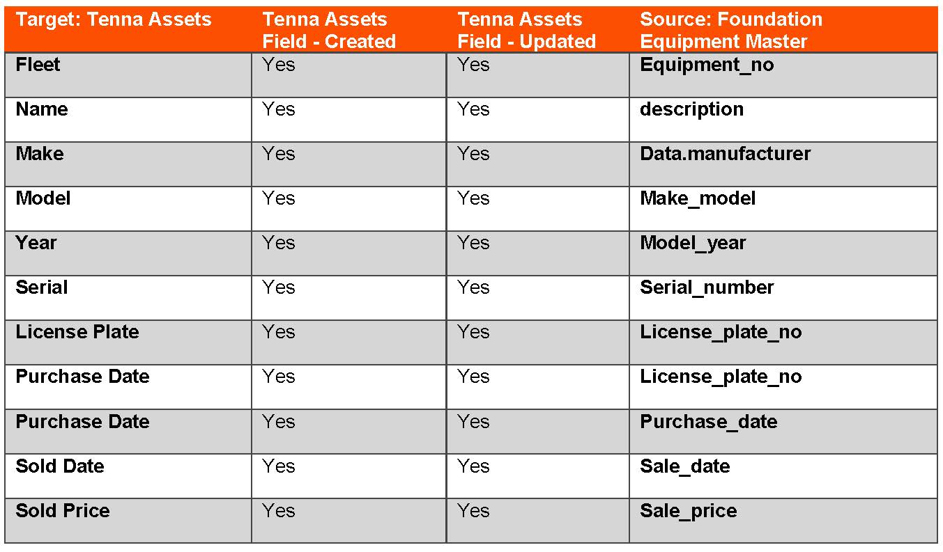 When equipment is added or updated in Foundation, the integration will search Tenna "Asset Fleet Number" to match Foundation "Equipment Number".