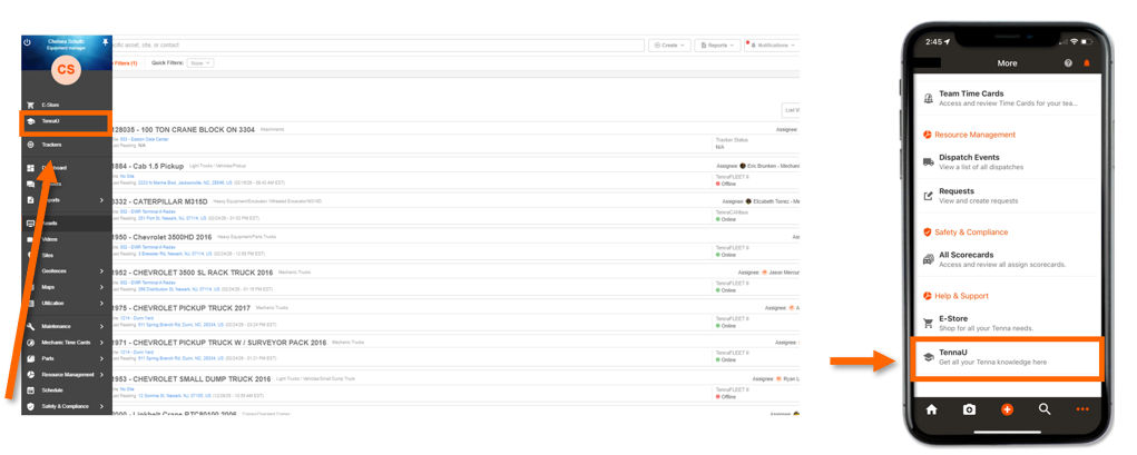 Always access TennaU through the lefthand navigation in Tenna (desktop) or the dotted icon on the app. Do not navigate directly to tennau.tenna.com, as this may cause login errors.