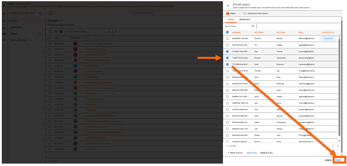 Select the users you are looking to add to the course by clicking the checkbox next to their username, then click "Next".
