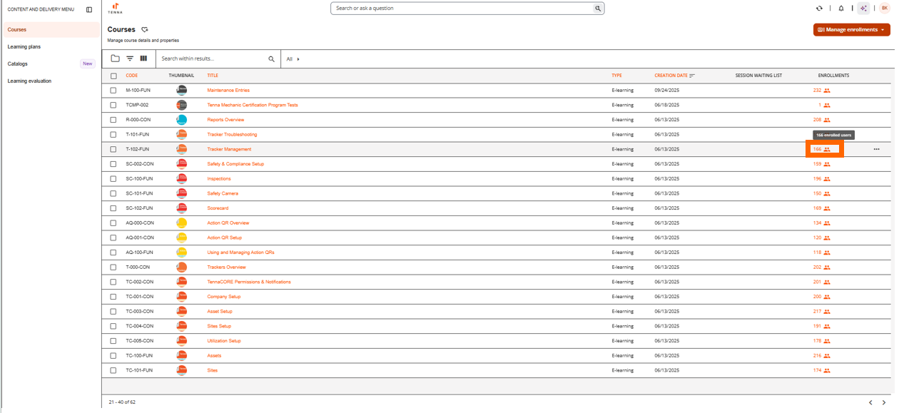 Enrolling users in the right courses ensures they receive the training they need. Once enrolled, courses will appear I the “Courses to Start” widget on their TennaU homepage.