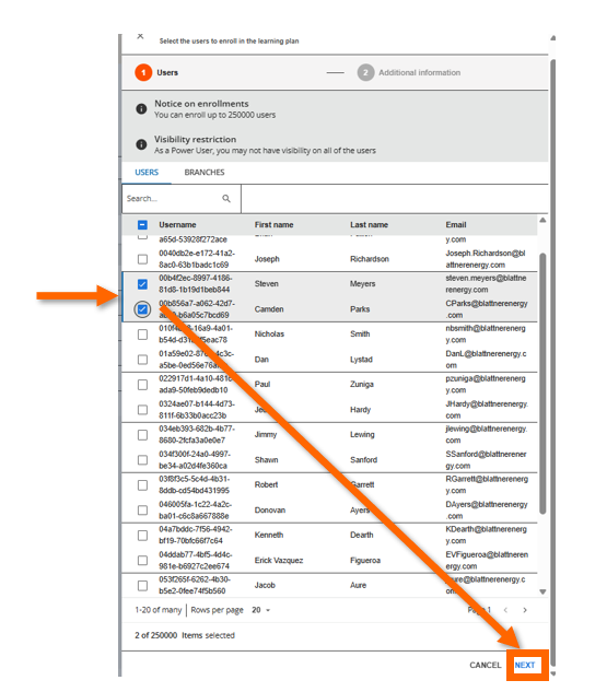 Select the users you are looking to add to the learning plan by clicking the checkbox next to their username, then click "Next".