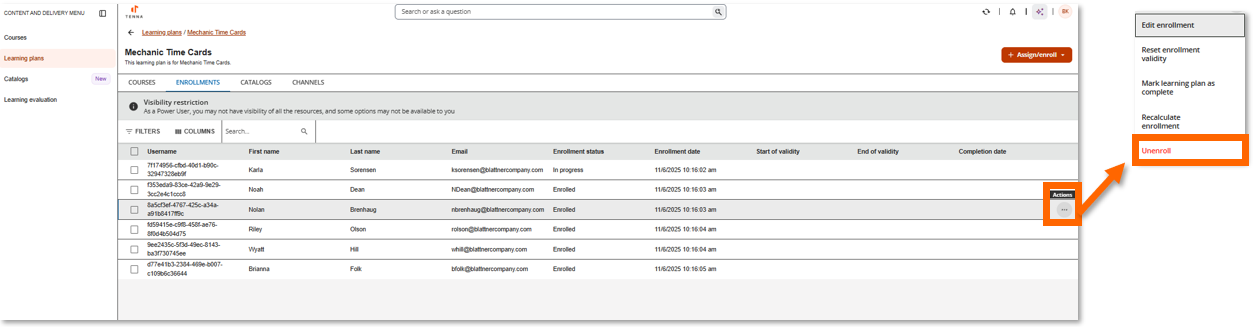 Click the "dotted icon" next to the user you need to unenroll from the learning plan, then click "Unenroll".